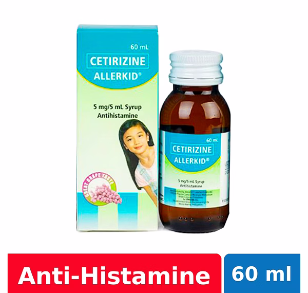 Allerkid Syrup is a colorless to slightly yellow-colored, clear syrup with fruity grape odor, and sweet grape taste. This medicine is used for the relief of symptoms associated with: allergic rhinitis such as sneezing, runny, itchy nose; and itchy, watery eyes; allergic conjunctivitis; skin symptoms of allergy such as itch and rash.