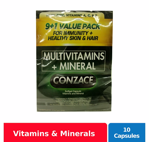 Conzace Capsule is a green, oblong, soft gelatin capsule. It has the highest levels of Zinc, Vitamins A, C, and E-proven to help immunity & the looks, like no other. This superior formulation combines all the molecules needed to give you healthy skin & hair. It also helps strengthen the immune system by 140% more vs. no supplementation.
