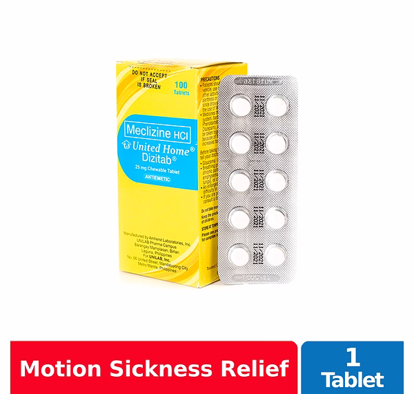 United Home Dizitab is a chewable tablet. It is used to prevent or treat nausea, vomiting, or vertigo (dizziness) due to motion sickness.