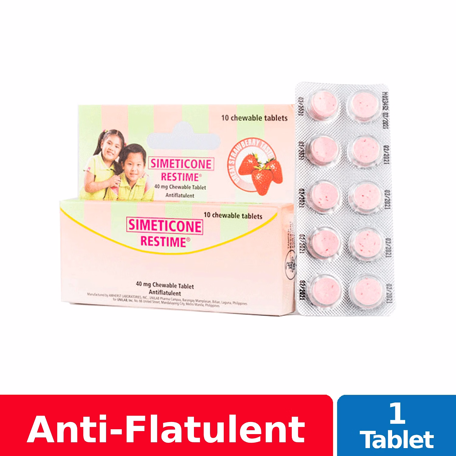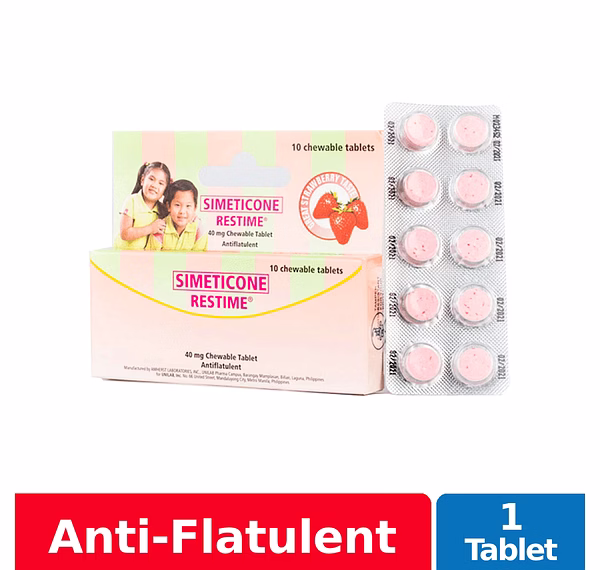 Restime Chewable Tablet is a round, speckled, pink-colored, and strawberry-flavored tablet chewable tablet. This medicine is used to relieve discomfort due to the accumulation of gas in the stomach and the intestines including sensations of bloating, pressure, fullness or stuffed feeling which can be caused by certain food (e.g., carbonated drinks, legumes, potatoes, infant formula, etc.), air swallowing, and dyspepsia.